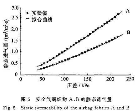 为了与动态透气性进行比较,采用美国PMI公司的CFP一1lO0一AEX孔径仪对安全气囊织物的静态透气性进行了测试.CFP一1100一AI孔径仪既可以用来测试织物的孔径大小及分布、渗透率,也可以测试织物的透气量.在测试过程中,计算机控制气体通过织物试样,在织物前后形成一定压差,此压差稳定一定时间后记录相应的气体流量,然后压差以小的增量增加至某一压差值,稳定一定时间后再记录此压差下的样品透气量,直到气流可以通过所有的孔径为止,因此可实现较大压差范围内的透气量测试.从其测试过程看,此测试为定常态的,是一种静态测试方法.测试时本地大气压为1.016 1×10的5次方Pa,环境温度为25℃,湿度为6O%.试样A,B的高压静态透气量测试结果和拟合曲线如图5所示.