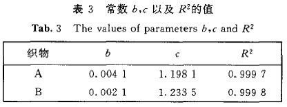 根据小二乘法,可以得到透气量与压差的拟合方程,其中6和c的值如表3所示.常数6表征了织物的透气性,其值越大透气性越好,而常数c表征了透气曲线的形状,其值越接近1表明其线性越好.从表3可以看出R2值均大于0.999 7,这说明用幂律关系可以很好地描述安全气囊织物静态透气量与压差的关系.从图5还可以看出,安全气囊织物静态透气量随压差的增加呈幂律增加,主要是因为静态测试时,气流通过织物并在织物的两侧形成稳定的压差需要一定的时间,在此过程中织物内纱线受气压作用形成一定大小的孔隙,随织物两侧的压差增加,织物内纱线形成的孔隙也增大,即织物的静态透气量随之增大.在相同压差下,和动态透气性相同,由于织物结构不同,织物A的透气量大于织物B的透气量.