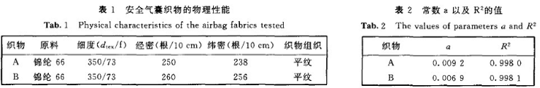 实验中,选用2块不同的锦纶66安全气囊织物试样,其物理性能如表1所示.
