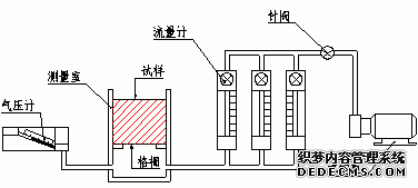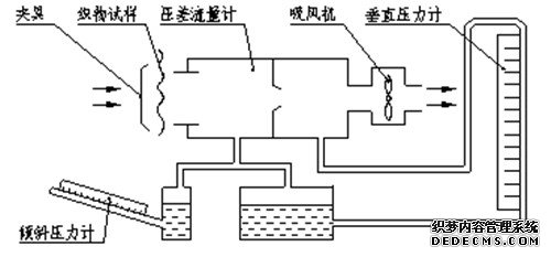 比较传统的试验方法(试验装置示意图参见图1):做一个内腔是长方体或圆柱体的测量室,在距离底面50mm处,放置一个开孔率大于70%的格栅,将按标准尺寸裁剪好的试样放在格栅上面。测量室一侧连接气压计或差压传感器,而另一侧连接空气流通装置。该装置一般由真空极限为6x10-2的真空泵和针阀开关组成,可使通过测量室的吸气达到足够的流量,并且流量可以调节。在测量室与空气流通装置之间安装流量测定装置,该装置采用三个平行的流量计,其中一个流量计用来测量气流量,另外两个用来验证流量值的读数,试验时气流量的选定值应位于满刻度的20%至80%之间。具体试验步骤:按规定把试样放在格栅上面后,开启真空泵,观察流量计,通过调节针阀,使流量逐渐接近规定值1分钟或达到稳定时,观察气压计或差压传感器,记录下压降△P。