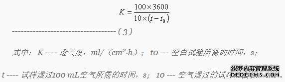 汽车工业一直以来都是产业用纺织品的大用户,ASTMD737、GB/T5453规定了纺织品透气度的测定方法。该标准的测试原理是:在规定的压差条件下,测定一定时间内垂直通过试样给定面积的气流流量,计算出透气率R。见公式(2):