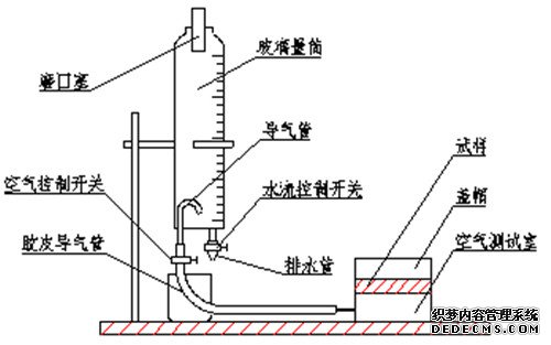 皮革透气度测试比较传统的试验方法(试验装置请参见图3):关闭水流控制开关和空气控制制开关,拔下磨口塞,向量筒中加水,并将磨口塞塞紧,然后打开水流控制开关,检查系统是否泄露。先不放试样,将水流控制开关关闭,将(20±3)℃的蒸馏水装满量筒后塞紧磨口塞。打开水流开关,再打开空气控制开关,水从排水管中流出,当水位下降到“0”刻度时,立即开动秒表,待水位降到刻度“100”时立即停止秒表,记录所需时间t0。然后放上试样,重复上面的操作,得到时间t。把测试结果代入公式(3),便求得透气度K。