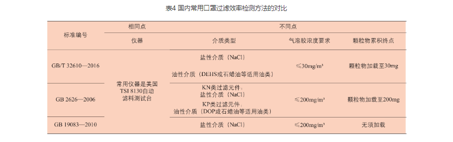 以上三个国内常用口罩标准过滤效率检测方法的异同总结见表4。