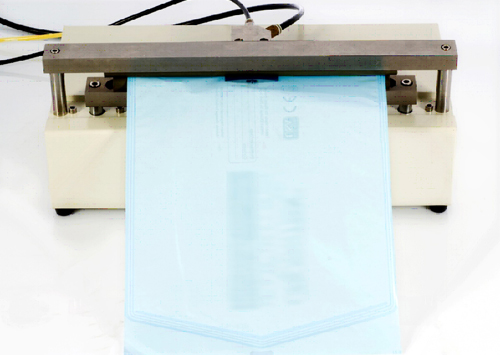 首先,双手捏住开口两侧,使纸塑灭菌袋上下两层分离。其次,把被测灭菌袋的开口部位放在上端固定横梁和下端可活动横梁中间,使充气口位于上下两层中间,双手拉紧灭菌袋两端启动夹紧开关,上下两端衡量闭合夹紧灭菌袋封口。如图2
