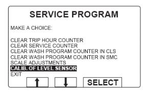 2.进入水位校正模式。点击面板-选择MENU--SERVICE MODE--CALIB. OF LEVEL SENSOR