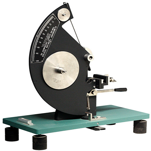 由于纱线间摩擦阻力的作用,滑动是有限的,在滑动时,经纱的张力迅速增大,变形伸长也急剧增加。当构成受力三角形底边的靠前根经纱拉伸至断裂伸长时,这根经纱断裂,第二根经纱的受力状态立即转化为靠前根经纱断裂前的状态,如此反复,经纱一根接一根的连续断裂,形成刀切一样的断裂面。由此可见,单缝法撕裂时,断裂的纱线是非受拉系统的纱线,拉伸力的方向与断裂纱线的原轴向垂直特殊的摆锤,对于测试厚的纺织品可增加高达64,000mN的重量,同时也要使用重型试样切刀。
