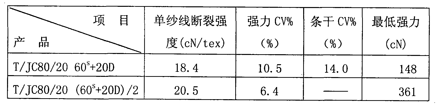 长丝经过导丝轮进入前钳ロ,长丝的牵伸倍数1. 12倍,细纱锭速12047r/min,细纱设计捻系数402,罗拉隔距18*35mm,后区牵伸1. 3倍,实测成纱质量:強力180. 57cN,强力CV% 10. 5,低强カ148cN,重量重偏+2. 5%,回潮2. 1%,条干CV% 14.0,千米细节9、 千米粗节30、千米棉结82、成纱实测捻度126. 9,捻系数397,