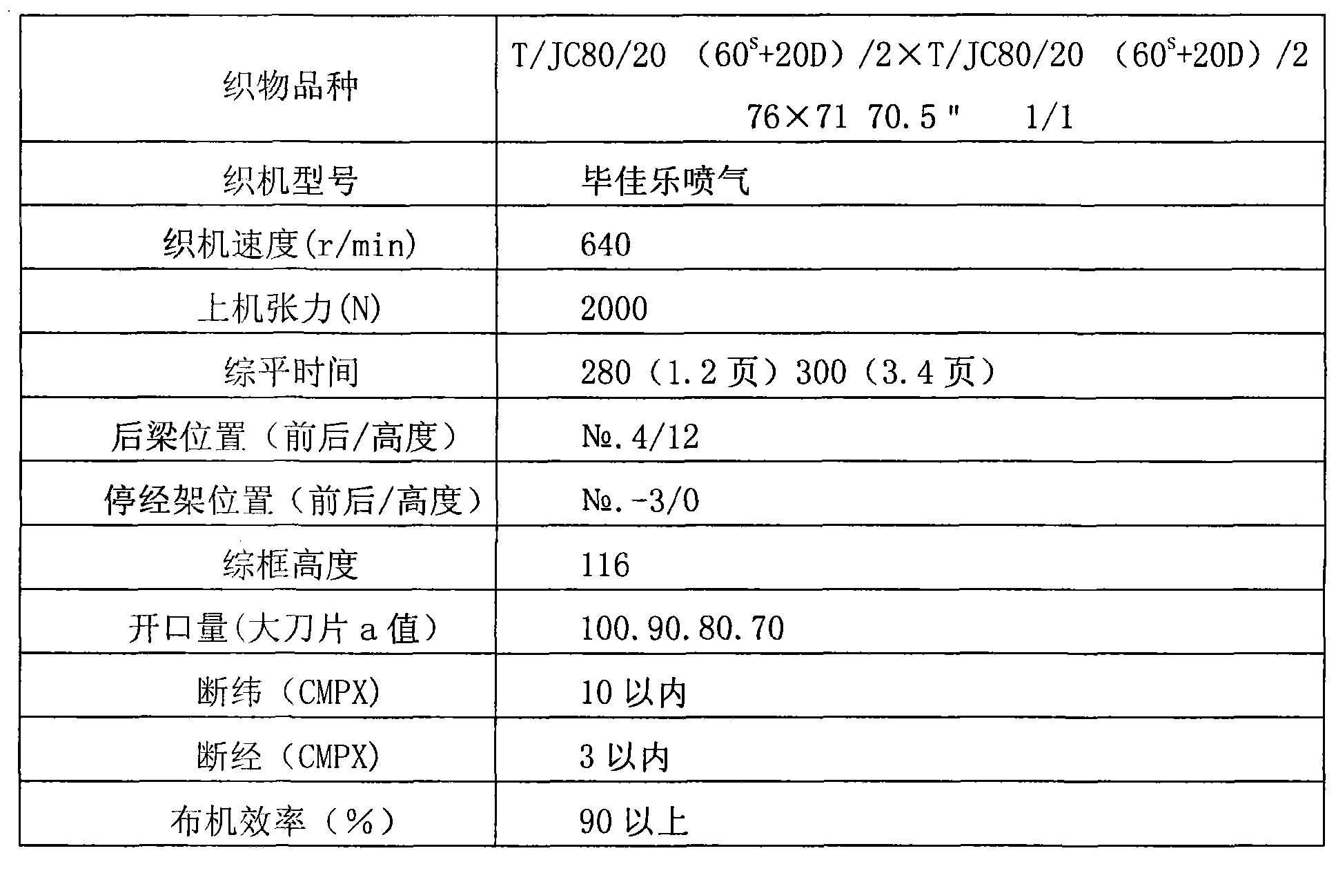 采用40环边撑,相对湿度78-82 %,断经接头时结头纱尾长度0. 3—0. 4厘米,织机速度640r/min,上机张カ2000N,综平时间1. 2页-观0、3. 4页-300,后梁位置前后/高度N2 . 4/12,停经架位置前后/高度N2 . -3/0,综框高度116,俊№量大刀片a 值-100. 90. 80. 70,断纬< 10CMPX,断经< 3CMPX。