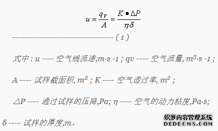 ISO4638、GB/T10655-2003规定了像聚氨脂泡沫这类多孔弹性高聚物材料空气透过率的测定方法。该标准的测试原理在于将一被控制的恒定流量的气流垂直通过试样,测定在试样两侧所造成的压力差△P。然后由Darcy定律求得材料的空气透过率,见公式(1):