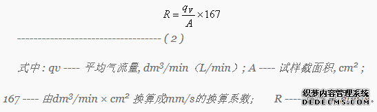 汽车工业一直以来都是产业用纺织品的大用户,ASTMD737、GB/T5453规定了纺织品透气度的测定方法。该标准的测试原理是:在规定的压差条件下,测定一定时间内垂直通过试样给定面积的气流流量,计算出透气率R。见公式(2):