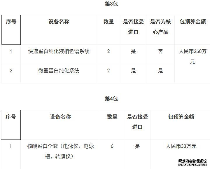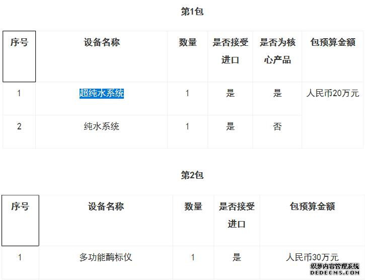 根据招标公告,本次采购共分为4包,总预算为333万元人民币。其中,包1采购超纯水系统和纯水系统两款仪器设备,预算20万元人民币;包2采购多功能酶标仪,预算30万元;包3采购快速蛋白纯化液相色谱系统和微量蛋白纯化系统,预算250万元人民币;包4采购核酸蛋白全套(电泳仪、电泳槽、转膜仪),预算33万元人民币。作为核心产品的超纯水系统指的是系统从原水至超纯水完整产生的生产系统,一般超纯水系统是经由多重过滤、离子交换、除气、逆渗透、紫外线、超滤、纳米率、离子吸附过滤所产生的的超纯水,广泛应用于生物、医药、汽车等领域。
