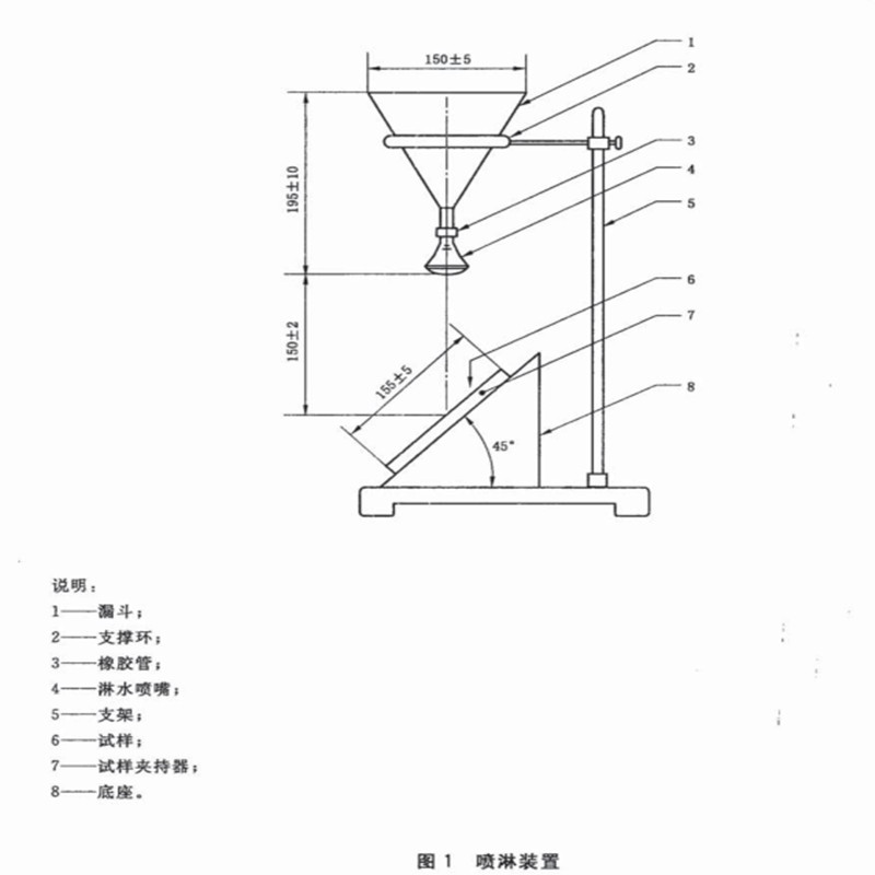 定量蒸馏水通过标准喷头以45°喷淋在喷嘴下方150mm处待测试样,测试后试样表面与标准图卡进行对照、评级。